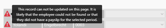 Please note: Should a red warning sign appear for an employee when editing information on the Bulk Input page, it is likely that the employee in question does not have a payslip for the selected period, or their payslip has already been finalised. Ensure that you have selected the applicable Filters (Pay Frequency and Period) for that employee.